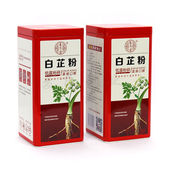 麥氏罐業鐵盒廠生產的白芷孢子粉鐵罐(白芷孢子粉鐵罐包裝,馬口鐵孢子粉鐵罐,孢子粉鐵罐廠家),尺寸:80*80*170mm,顏色:紅白色,材質為0.23鍍錫馬口鐵,印刷精美別致,堅固耐用,是國內白芷孢子粉鐵罐鐵盒包裝生產加工廠家!