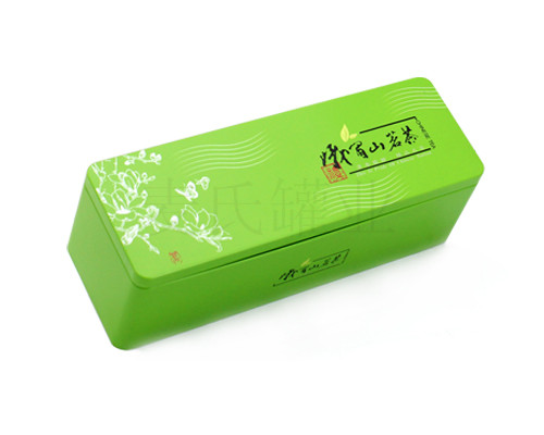 此款長方形綠茶鐵盒是用來包裝茶葉的一種金屬包裝鐵盒,印刷美觀,適宜保存,大批量定制價格低,麥氏罐業可定制各種尺寸相關的信陽毛尖茶鐵皮盒子,是的茶葉馬口鐵盒生產加工廠家。
