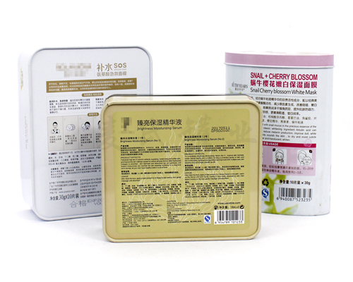這幾款化妝品包裝鐵盒產品,是幾款正方形、橢圓形等形狀的包裝產品,適用于面膜、眼膜、精油等化妝品產品。
