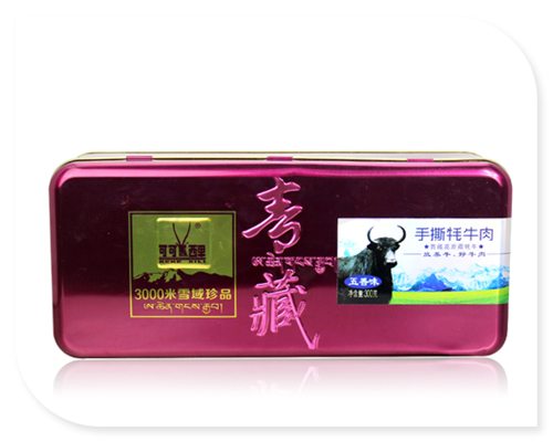 此款青海耗牛肉干鐵盒結構是四片罐方式,由雙蓋、身、底組合而成,蓋子為內卷線內塞蓋,盒身有內卷線處理,盒底是內卷線鑼底制成。所采用的材質為0.23mm的鍍錫馬口鐵制成,盒形是目前受歡迎的包裝盒,為了更好的適應市場需求,同時您可尋找其他鐵料制作,例如磨砂鐵料。