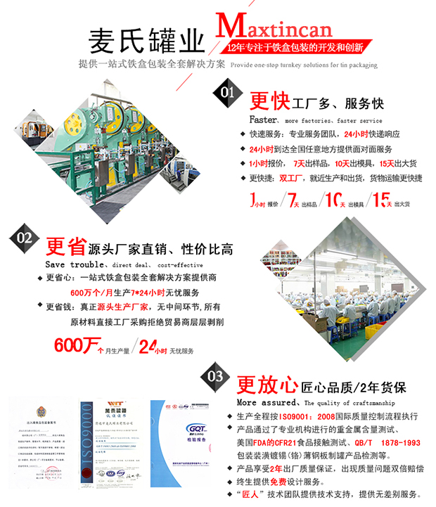 麥氏罐業 擁有10多年鐵盒、鐵罐生產經驗,事實勝于雄辯!我們才是真正具有實力的鐵罐、鐵盒生產廠家!